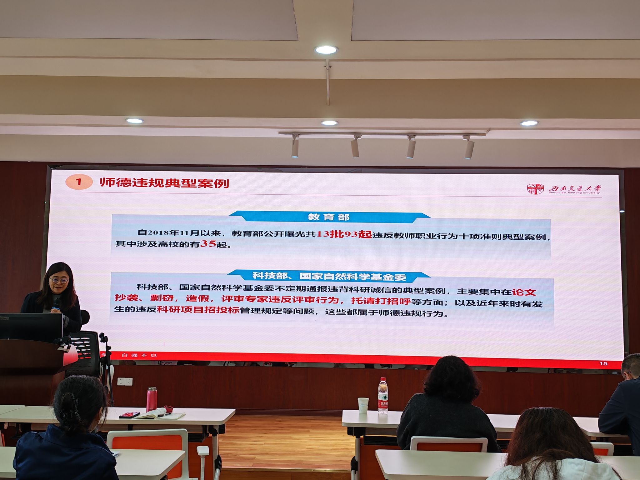 刘咏梅以“恪守十项准则,涵养高尚师德”为题,首先从师德师风建设的重要性出发,强调了教师个人加强自身师德师风建设的重要意义。随后,刘书记带领大家学习了《新时代高校教师职业行为十大准则》的主要内容,她强调教师要积极弘扬教育家精神,将教书与育人相结合,在传授专业知识的同时,更要注重培养学生的家国情怀与社会责任感,以自己高尚的道德情操和职业操守做好学生的榜样。最后,刘书记组织大家学习了近年来高校违反师德师风典型案例,通过以案为镜、以案明纪,督促全体教职工在日常工作和生活中加强纪律意识和规矩意识,知敬畏、存戒惧、守底线。