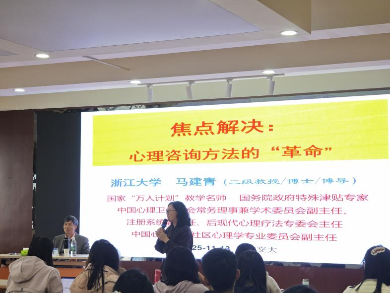 2025年11月13日下午,由心理研究与咨询中心主办的创源大讲堂“焦点解决:心理咨询方法的革命”在犀浦校区X5501成功开讲。浙江大学马建青教授担任主讲,心理研究与咨询中心主任高雪梅教授主持本次活动。