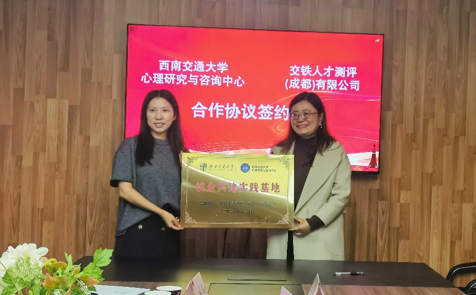 随后,高雪梅主任与梁瑞总经理分别代表双方签署了校企合作协议。刘咏梅书记向交铁测评授予“西南交通大学心理研究与咨询中心实践基地”牌匾,标志着双方合作进入新阶段。