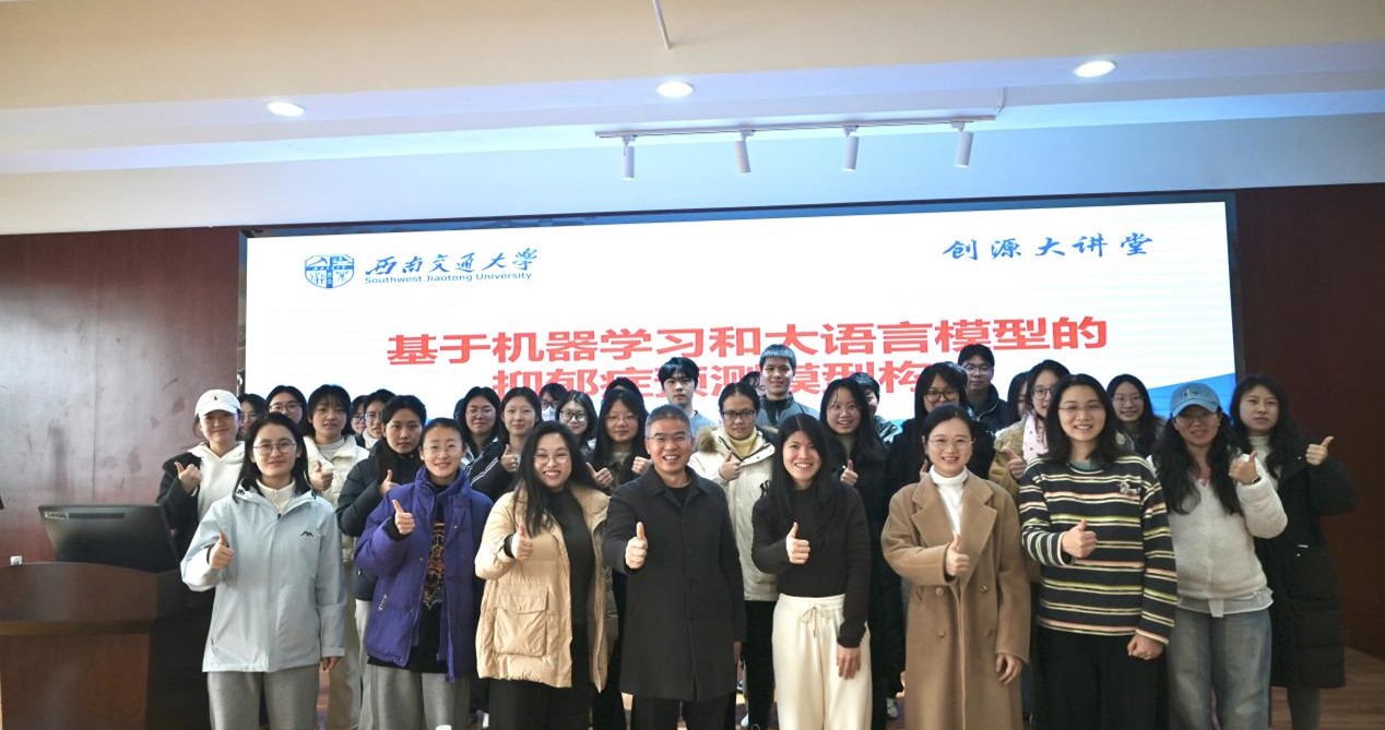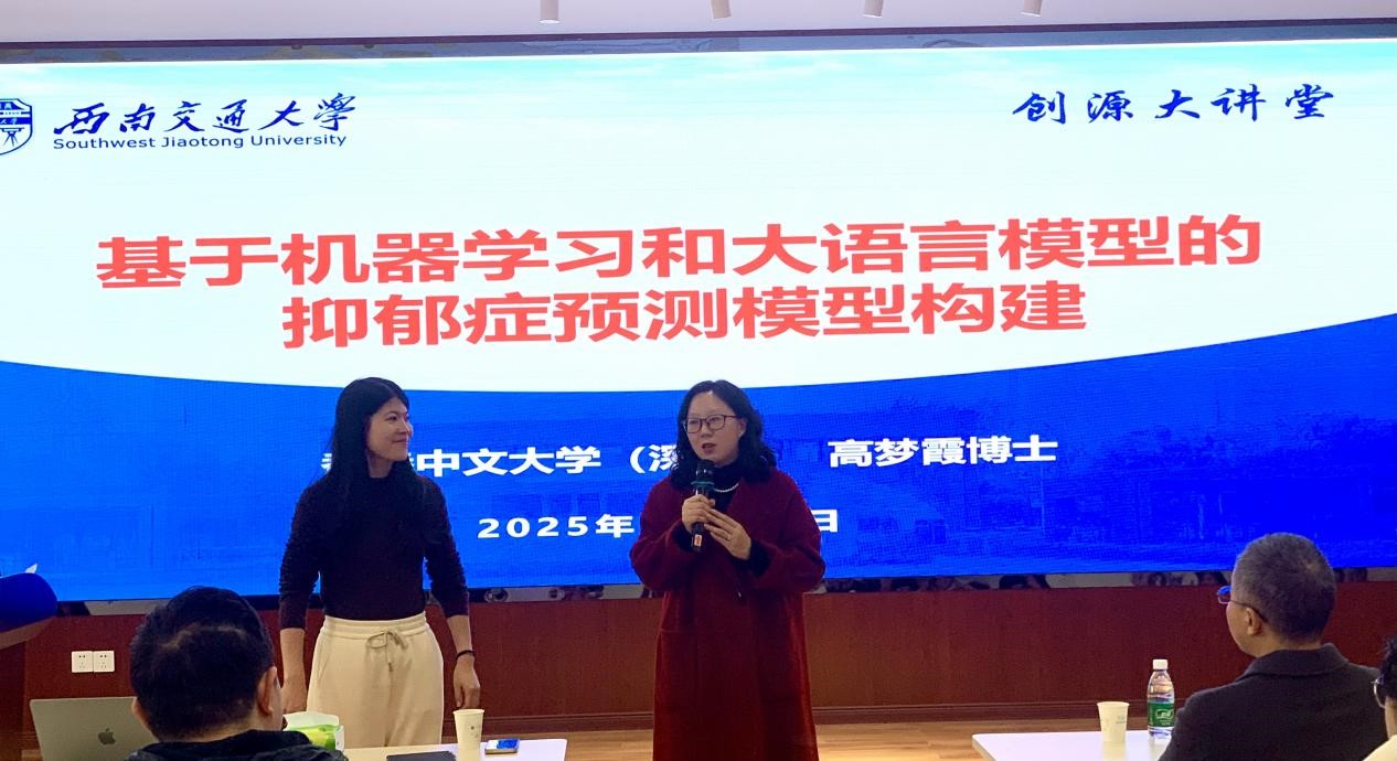 2025年12月29日上午,创源大讲堂“基于机器学习和大语言模型的抑郁症预测模型构建”在犀浦校区X5501开讲。本次讲座特邀香港中文大学(深圳)计算社会科学与应用心理学学部助理教授高梦霞博士担任主讲,心理中心主任高雪梅教授主持本次活动,中心副主任李启明、冯缙等近40位师生参加活动。
