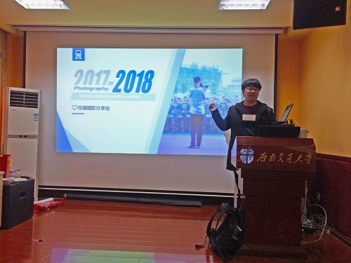 紧接着,培训进入了重点环节。此次培训特别邀请到了西南交大党委宣传部新媒体中心副理事长孙士清同学为大家详细地介绍了有关传媒摄影的内容。分享的第一部分是照相机的使用,其中包含了镜头、快门、光圈、感光度、档位等这些专业的参数设置。孙同学还现场带领大家用手机相机体验不同的曝光度带来的效果。第二部分是新闻照片构图部分,孙同学为大家传授了很多摄影构图的技巧,如拍摄会议或者活动照片时,一定要有整个活动的全景图和主讲人或者领导的特写照片,学会抓拍重要的时刻和细节;在拍摄合照时,水平线一定要齐平,且要为后期裁剪留出足够的空间;构图时尽量采用三分法,或者直接将人物放在画面正中间等等,实用性极强的分享让大家获益匪浅。